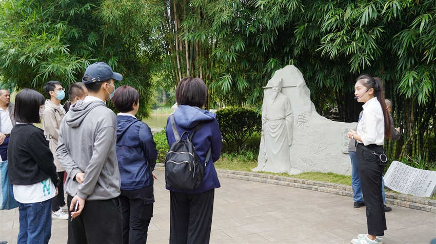 參觀的第二站是竹園,一走進(jìn)竹園,“竹未出土先有節(jié)”這句漢白玉雕刻的詩詞在郁郁蔥蔥的竹林掩映下十分醒目。園區(qū)分為“頌竹”“品竹”“聽竹”“知竹”,完美地將“景”與風(fēng)清氣正的“廉”融合,構(gòu)成“半山半水半竹林”的雅致景色。在參觀過程中,講解員向大家訴說著古代清官廉吏的典故,感受著先輩們剛正廉明的優(yōu)秀品質(zhì),也體會(huì)到古往今來的“廉竹精神”。