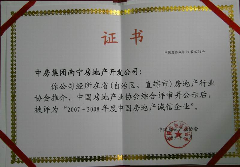 熱烈祝賀中房集團(tuán)南寧房地產(chǎn)開(kāi)發(fā)公司榮獲2007-2008年度中國(guó)房地產(chǎn)誠(chéng)信企業(yè)